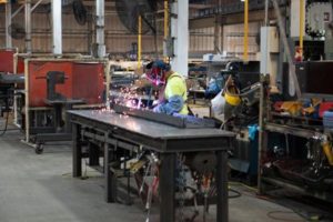 Julio Ventura welds a screed bottom for a commercial class road paver at the Calder Brothers factory in Taylors, South Carolina, U.S., in this handout picture taken July 18, 2021. Brandon Granger/Calder Brothers Corporation/Handout via REUTERS