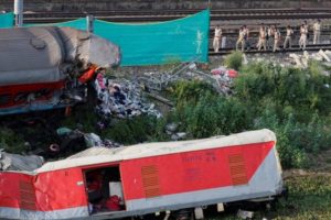 Policemen walk on rail tracks near damaged coaches at the site of a train collision following the accident in Balasore district in the eastern state of Odisha, India, June 5, 2023. REUTERS/Adnan Abidi