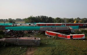 A train moves past damaged coaches, after the tracks were restored, at the site of a train collision following the accident in Balasore district in the eastern state of Odisha, India, June 5, 2023. REUTERS/Adnan Abidi