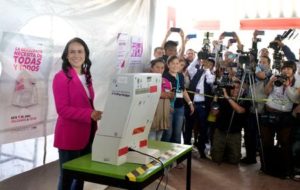 Alejandra del Moral, candidate for governor of the State of Mexico for the Institutional Revolutionary Party (PRI) politician fronting an opposition alliance poses before casts her vote during the election day for governor for the state of Mexico at a polling station in Cuautitlan Izcalli, Mexico June 4, 2023, in this photo released and distributed by Prensa Alejandra del Moral. Prensa Alejandra del Moral/Handout via REUTERS THIS IMAGE HAS BEEN SUPPLIED BY A THIRD PARTY. NO RESALES. NO ARCHIVES.
