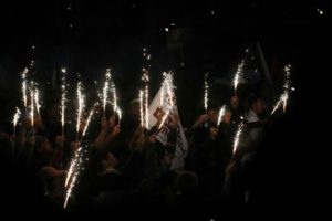 Supporters of Delfina Gomez, candidate for governor of the State of Mexico for the National Regeneration Movement (MORENA), hold up flares in celebration after preliminary results of the state election were announced, in Toluca, Mexico June 4, 2023. REUTERS/Henry Romero