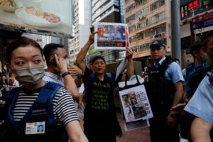 Police detain a woman who holds placards to promote knee maintenance in downtown Hong Kong on the 34th anniversary of the 1989 Beijing Tiananmen Square crackdown, near the location where the candlelight vigil is usually held, in Hong Kong, China June 4, 2023. REUTERS/Tyrone Siu