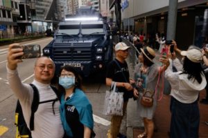 Passerby pose for photos in front of a police armored vehicle in downtown on the 34th anniversary of the 1989 Beijing’s Tiananmen Square crackdown, near where the candlelight vigil is usually held, in Hong Kong, China June 4, 2023. REUTERS/Tyrone Siu