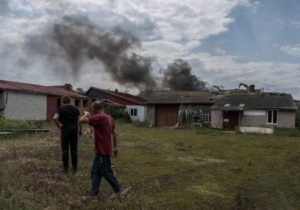 Local residents walk while smoke rises after shelling, amid Russia’s attack on Ukraine, near the Ukraine-Russia border in the town of Vovchansk, in Kharkiv region, Ukraine June 5, 2023. REUTERS/Viacheslav Ratynskyi