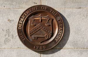 FILE PHOTO: A bronze seal for the Department of the Treasury is shown at the U.S. Treasury building in Washington, U.S., January 20, 2023. REUTERS/Kevin Lamarque