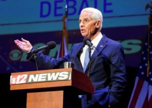 FILE PHOTO: Democratic Party gubernatorial candidate Charlie Crist, a former governor, debates Florida’s Republican incumbent Gov. Ron DeSantis at the Sunrise Theatre in Fort Pierce, Florida, U.S. October 24, 2022. Crystal Vander Weiter/Pool via REUTERS