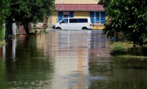 A vehicle moves along a flooded street, that submerged in water following the collapse of the Nova Kakhovka dam in the course of Russia-Ukraine conflict, in the town of Nova Kakhovka in the Kherson region, Russian-controlled Ukraine, June 7, 2023. REUTERS/Alexander Ermochenko