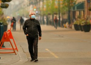 FILE PHOTO: A man wears a mask as some 90 wildfires are active in Alberta, with 23 out of control, according to the provincial government, in Calgary, Alberta, Canada May 16, 2023. REUTERS/Leah Hennel/File Photo