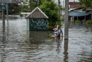 A local resident walks along a flooded street during an evacuation from a flooded area after the Nova Kakhovka dam breached, amid Russia’s attack on Ukraine, in Kherson, Ukraine June 8, 2023. REUTERS/Vladyslav Musiienko