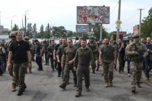 Ukraine’s President Volodymyr Zelenskiy visits a flooded area after the Nova Kakhovka dam breached, amid Russia’s attack on Ukraine, in Kherson, Ukraine June 8, 2023. REUTERS/Stringer