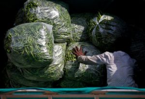 A man loads green chilies onto a supply tempo at a wholesale vegetable market in Ahmedabad, India, June 8, 2023. REUTERS/Amit Dave