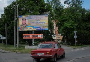 A view shows a board commemorating a dead Ukrainian soldier, father of four children, who was killed during fighting with Russian troops, amid Russia’s attack on Ukraine, in Poltava, Ukraine May 24, 2023. REUTERS/Dan Peleschuk