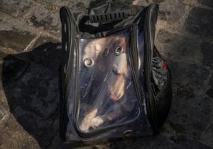 A dog is seen in a carry-on after local residents were evacuated from a flooded area after the Nova Kakhovka dam breached, amid Russia’s attack on Ukraine, in Kherson, Ukraine June 7, 2023. REUTERS/Vladyslav Musiienko