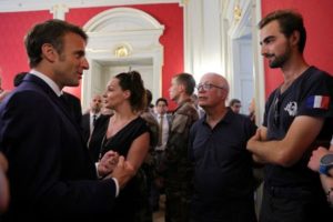 French President Emmanuel Macron talks with Henri, the 24-year-old ‘backpack hero’, as Youssouf, who suffered minor stab wounds as he tried to intercept the suspect as he fled, looks on during a meeting with rescue forces at the Haute-Savoie prefecture, the day after several children and adults were injured in a knife attack at the Le Paquier park near the lake in Annecy, in the French Alps, France, June 9, 2023. REUTERS/Denis Balibouse/Pool