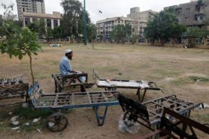 A labourer waits for work while sitting beside push trollies outside a market in Karachi, Pakistan June 8, 2023. REUTERS/Akhtar Soomro