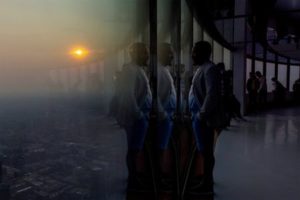A person looks down towards the city as a smokey Toronto is seen from the CN Tower as wildfires in Ontario and Quebec continue to burn, in Toronto, Ontario, Canada June 6, 2023. REUTERS/Carlos Osorio