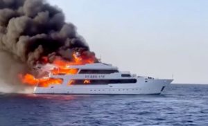 Plumes of smoke erupt from a yacht on fire in Marsa Alam, Egypt, June 11, 2023 in this screengrab taken from a handout video. Mohamed Al-Saif/Handout via REUTERS