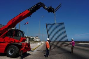 FILE PHOTO: Workers replace part of the fence of the U.S. Embassy during a renovation work in Havana, Cuba, May 23, 2023. REUTERS/Alexandre Meneghini