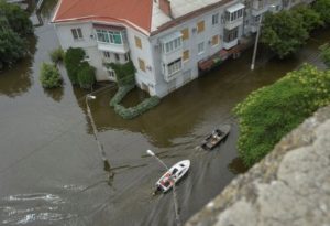 Volunteers sail on boats at a flooded street during evacuation from a flooded area after the Nova Kakhovka dam breached, amid Russia’s attack on Ukraine, in Kherson, Ukraine June 10, 2023. REUTERS/Oleksandr Klymenko