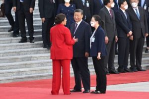 Honduran President Xiomara Castro and Chinese President Xi Jinping chat during a welcome ceremony outside the Great Hall of the People in Beijing, China on June 12, 2023. Wang Zhao/Pool via REUTERS