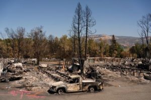 FILE PHOTO: A burned tuck sits in front of burned homes in a mobile home park that was destroyed by wildfire in Phoenix, Oregon, U.S. September 20, 2020. REUTERS/David Ryder