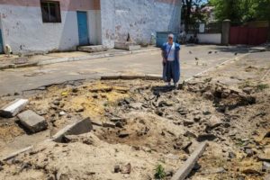 Iryna Radetska, the deputy head of a Kherson’s school, stands next to the crater left by a shell hit near the school she used to work in, amid Russia’s attack on Ukraine, in Kherson, Ukraine, June 9, 2023. REUTERS/Yurii Kovalenko