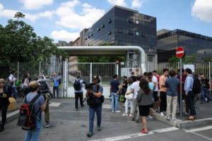 Members of the media work as people gather outside San Raffaele hospital where former Italian Prime Minister Silvio Berlusconi died in Milan, Italy, June 12, 2023. REUTERS/Claudia Greco