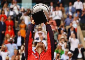 Tennis – French Open – Roland Garros, Paris, France – June 11, 2023 Serbia’s Novak Djokovic lift up the trophy after winning the French Open REUTERS/Kai Pfaffenbach