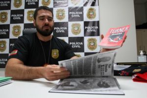 Police detective Arthur Lopes shows books seized from a neo-Nazi group who call themselves Crew 38 in Florianopolis, Santa Catarina state, Brazil April 24, 2023. REUTERS/Cristiano Estrela