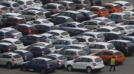 A worker walks beside newly produced cars ready for shipment at a port in Kawasaki