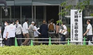 Shareholders arrive to attend Toyota Motor’s annual general meeting at