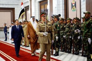 Iraqi Prime Minister Mohammed Shia al-Sudani walks with Qatar’s Emir Sheikh Tamim bin Hamad al-Thani during a welcome ceremony, in Baghdad, Iraq June 15, 2023. Iraqi Prime Minister Media Office/Handout via REUTERS