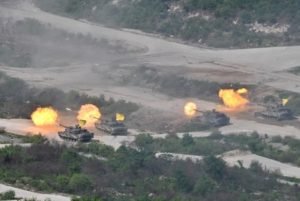 South Korea’s K-2 tanks fire during a South Korea-US joint military drill at Seungjin Fire Training Field in Pocheon, South Korea June 15, 2023. Jung Yeon-je/Pool via REUTERS