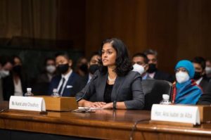 Nusrat Choudhury, a nominee to serve as a federal judge in the Eastern District of New York, appears before the U.S. Senate Judiciary Committee in Washington, D.C. on April 27, 2022. U.S. Senate/Handout via REUTERS