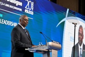 FILE PHOTO: U.S. Secretary of Defense Lloyd Austin speaks at the First Plenary Session of the 20th IISS Shangri-La Dialogue in Singapore June 3, 2023. REUTERS/Caroline Chia/File Photo