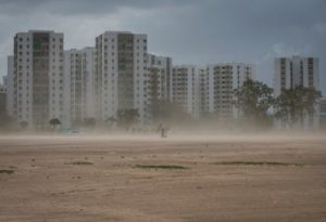A couple rides a scooter amid dust due to strong wind, before the arrival of cyclonic storm Biparjoy, in Ahmedabad, India, June 15, 2023. REUTERS/Amit Dave