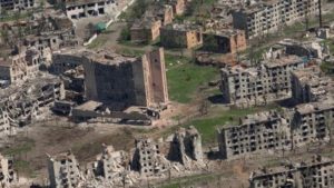 Aerial view shows destroyed buildings as a result of intense fighting, amid the Russian invasion, in Bakhmut, Ukraine in this still image from handout video released June 15, 2023. 93rd Kholodnyi Yar Brigade/Handout via REUTERS