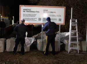 FILE PHOTO: Royal Canadian Mounted Police (RCMP) officers unveil a new sign at Roxham Road, an unofficial crossing point from New York State to Quebec for asylum seekers, in Champlain, New York, U.S. March 25, 2023.REUTERS/Christinne Muschi
