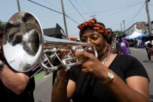 FILE PHOTO: Trumpeter Crystal Howard marches down the street while playing with her band during a block party to mark Juneteenth, which commemorates the end of slavery in Texas, over two years after the 1863 Emancipation Proclamation freed slaves elsewhere in the U.S., in Nashville, Tennessee, U.S., June 17, 2023. REUTERS/Kevin Wurm/File Photo