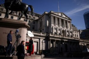 A television news crew works outside the Bank of England in the City of London financial district in London, Britain May 11, 2023. REUTERS/Henry Nicholls/File photo