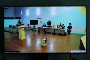 Russian opposition politician Alexei Navalny, his lawyers Olga Mikhailova and Vadim Kobzev and other participants are seen on a screen via a video link during an external hearing of the Moscow City Court in a new criminal case against Navalny on numerous charges, including the creation of an extremist organization, at the IK-6 penal colony in the Vladimir region, Russia, June 19, 2023. REUTERS/Evgenia Novozhenina