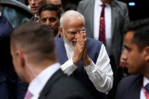 Indian Prime Minister Narendra Modi greets supporters as he arrives at the Lotte hotel in New York City, New York, U.S., June 20, 2023. REUTERS/Mike Segar