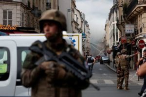 French soldiers and police secure the area as firefighters work after several buildings on fire following a gas explosion in the fifth arrondissement of Paris, France, June 21, 2023. REUTERS/Gonzalo Fuentes