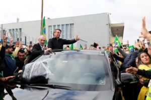 Brazil’s former President Jair Bolsonaro gestures as he greets supporters at Salgado Filho International Airport, on the day the Electoral Justice begins the trial to determine his political rights, as he arrives in Porto Alegre, Rio Grande do Sul, Brazil, June 22, 2023. REUTERS/Diego Vara