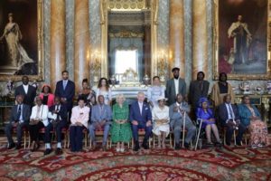 Britain’s King Charles and Queen Camilla pose with Linda Haye, Laceta Reid, Gilda Oliver, Carmen Esme Munroe, Edna Henry, Jessie Stephens, Delisser Bernard, John Richards and Alford Gardener during a reception to mark the 75th anniversary of the arrival of HMT Empire Windrush to British shores, at Buckingham Palace on June 14, 2023 in London, Britain. During the reception to celebrate the Windrush Generation, ten portraits of Windrush elders were unveiled. Chris Jackson/Pool via REUTERS