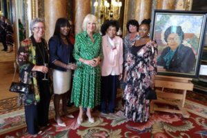 Britain’s Queen Camilla poses Linda Haye and her family with during a reception to mark the 75th anniversary of the arrival of HMT Empire Windrush to British shores, at Buckingham Palace on June 14, 2023 in London, Britain. During the reception to celebrate the Windrush Generation, ten portraits of Windrush elders were unveiled. Chris Jackson/Pool via REUTERS