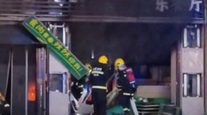 Firefighters work at the fire scene following a gas explosion at a barbecue restaurant in Yinchuan city, Ningxia, China, on June 21, 2023 in this screengrab obtained from a handout video. Video Obtained By Reuters/Handout via REUTERS