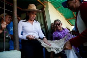 Venezuelan opposition leader Maria Corina Machado receives a gift from a supporter during a rally ahead of the October presidential primary, in Aguasay, Monagas State, Venezuela March 27, 2023. REUTERS/Leonardo Fernandez Viloria