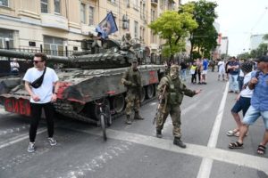 People gather in a street as fighters of Wagner private mercenary group are deployed near the headquarters of the Southern Military District in the city of Rostov-on-Don, Russia, June 24, 2023. REUTERS/Stringer