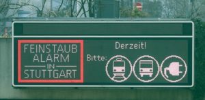 FILE PHOTO: A sign alerting about fine particulates is seen in downtown Stuttgart, Germany, February 6, 2019. REUTERS/Michael Dalder/File Photo